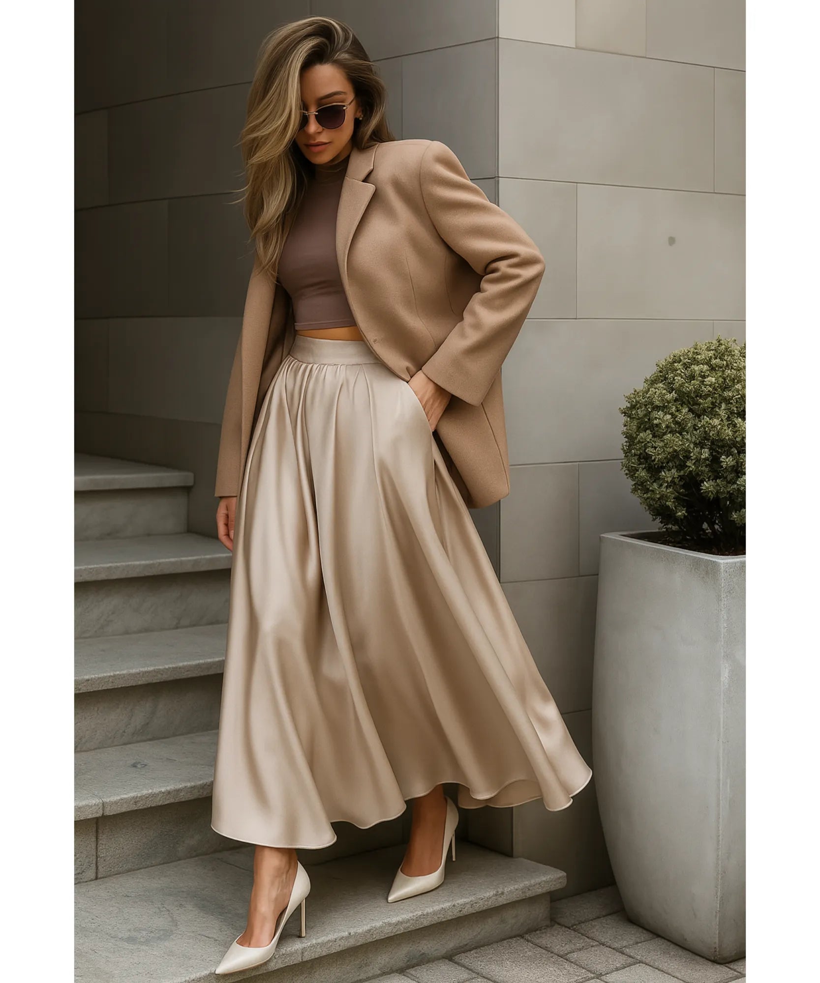 Some pieces just make you feel different the moment you put them on. This women's flowy satin maxi skirt is one of them. The silky satin fabric catches the light with every movement, creating a subtle luminous effect that feels effortlessly polished without trying too hard.