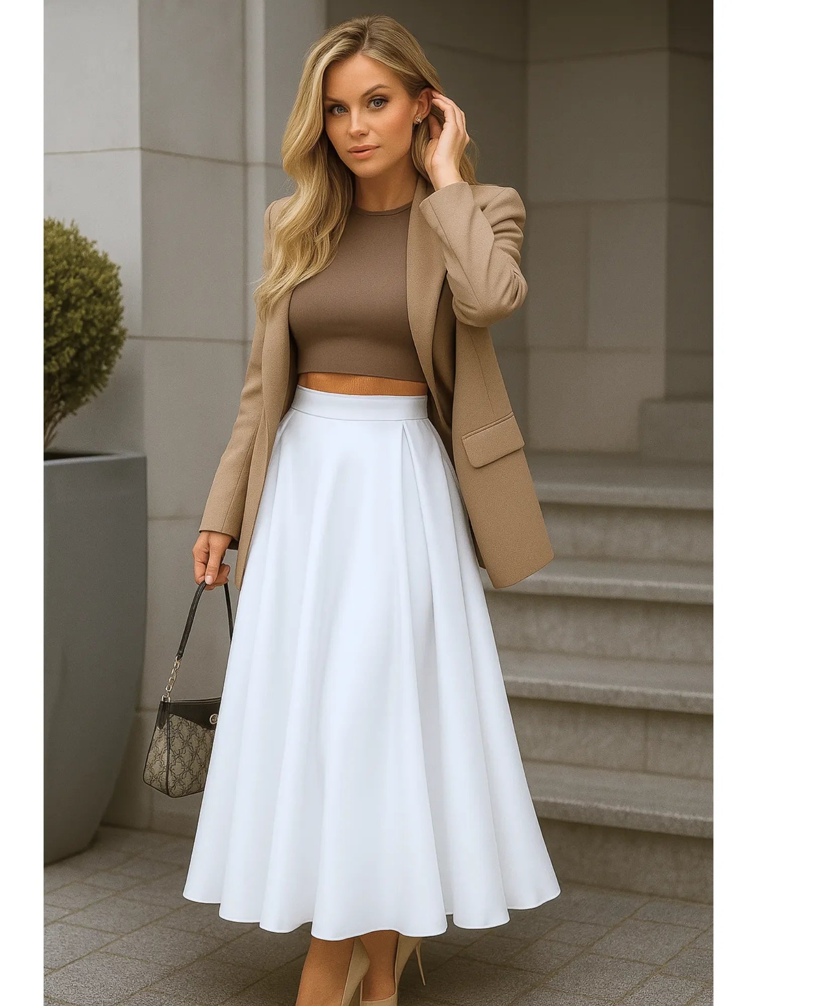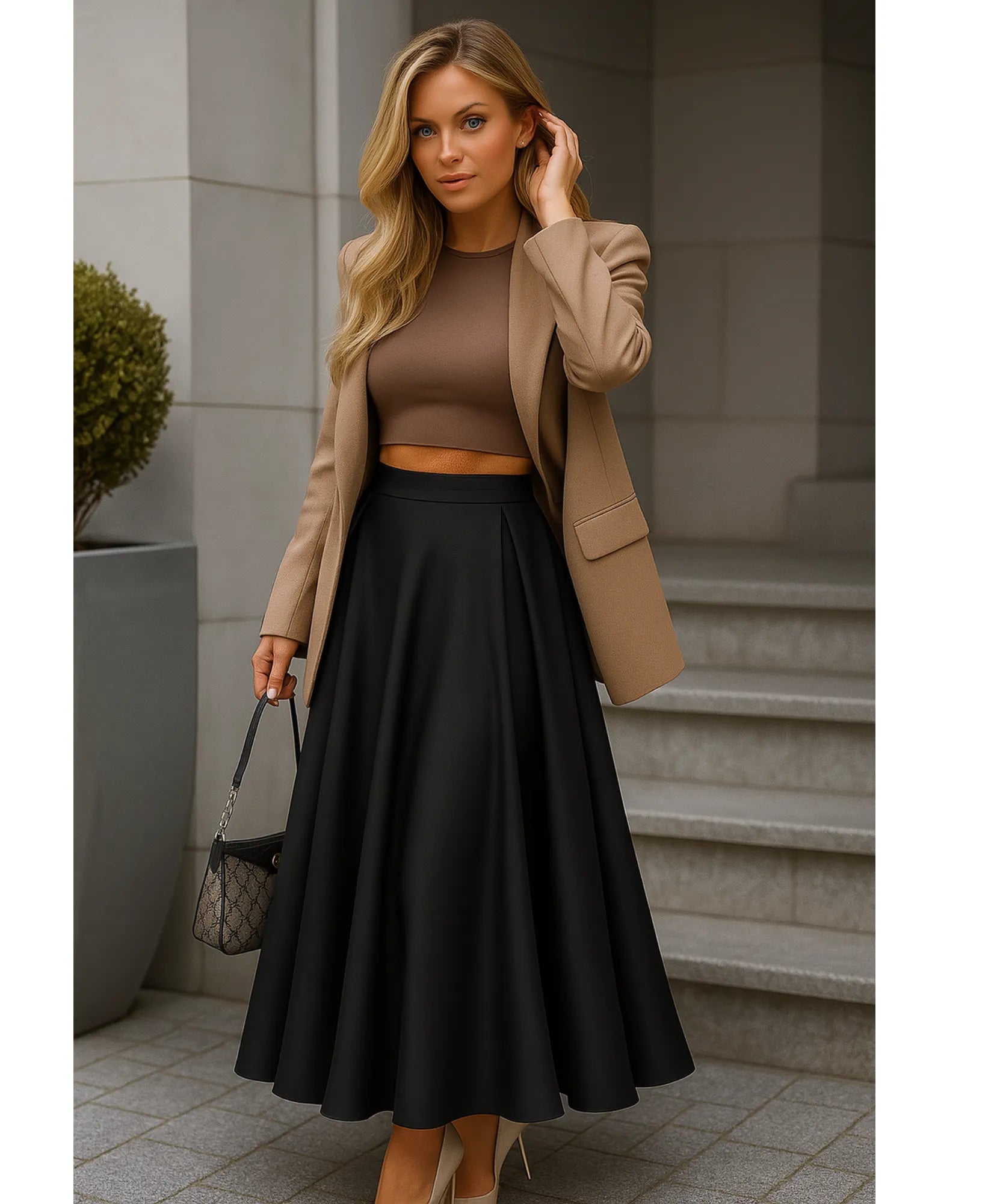 • Office styling paired with a structured blouse and heels