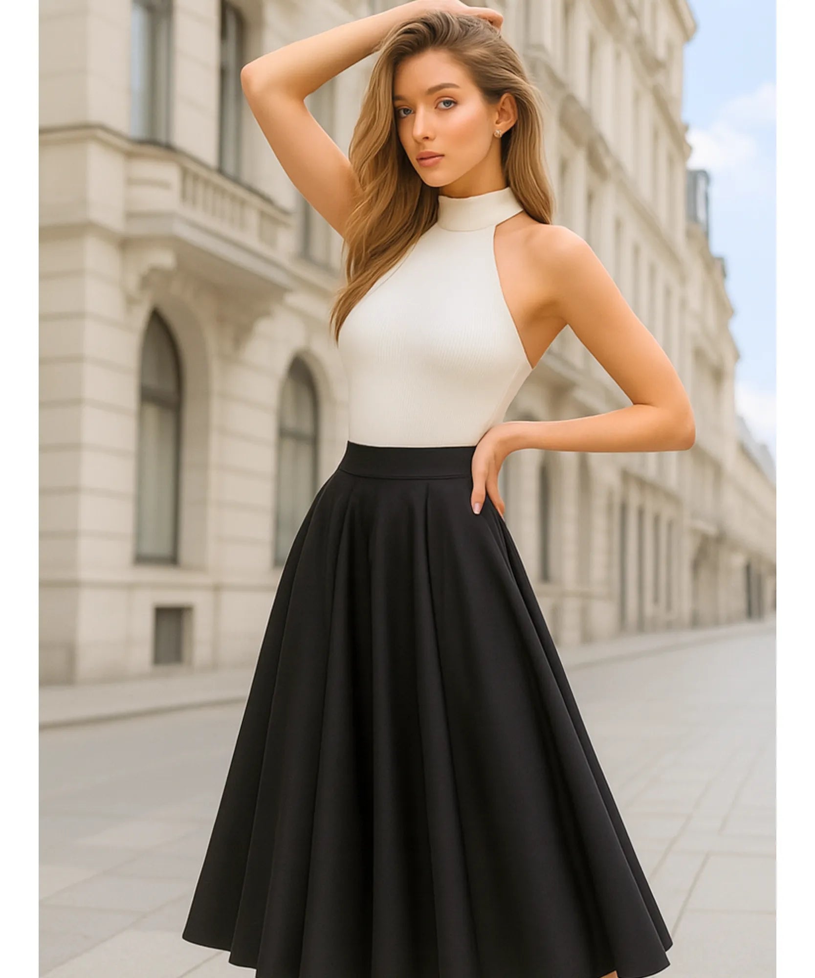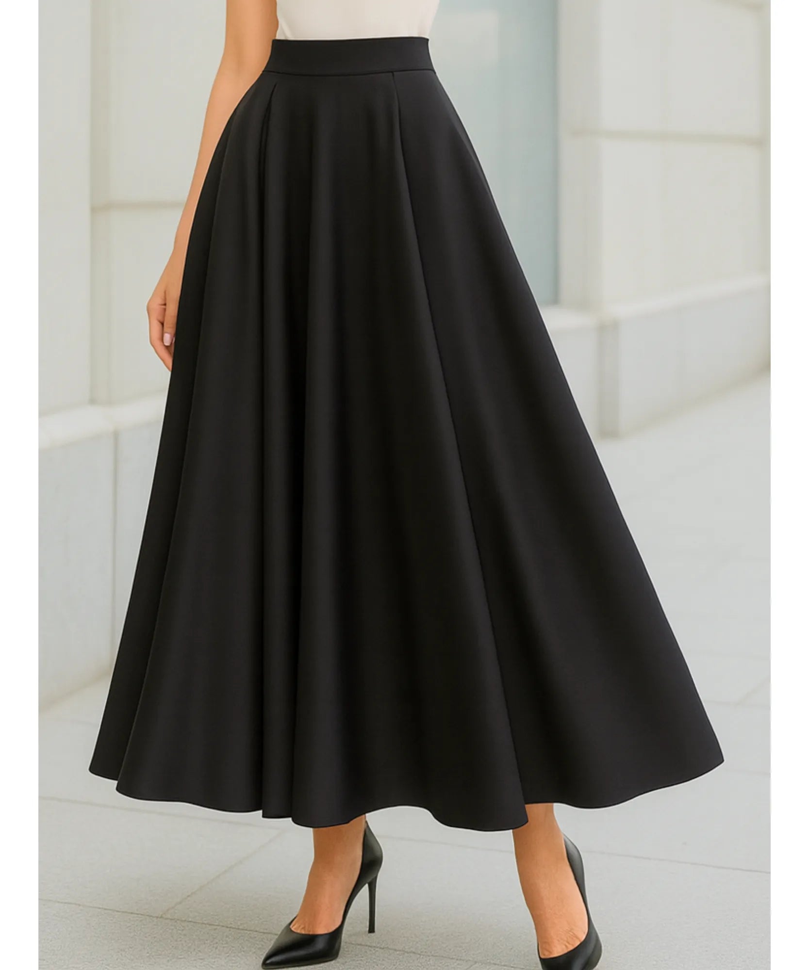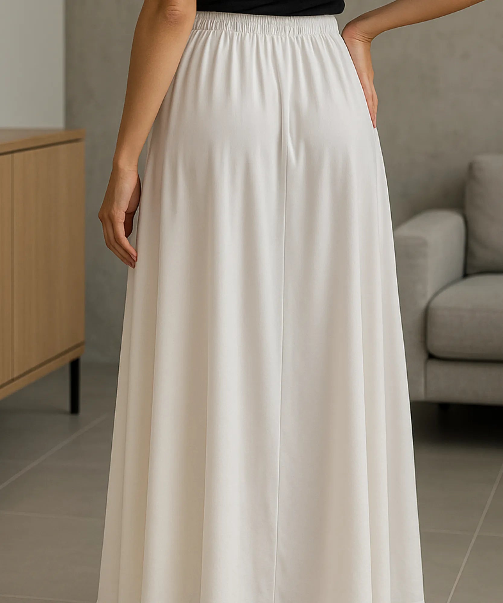 The invisible elastic waistband sits comfortably at the natural waist, offering a secure fit without visible lines or bulk. The ankle-length hem is calibrated to hit at just the right point — elegant enough for heels, balanced enough for flats.