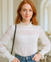The pleated high neck brings a romantic charm that combines with puffed sleeves with gathered cuffs.