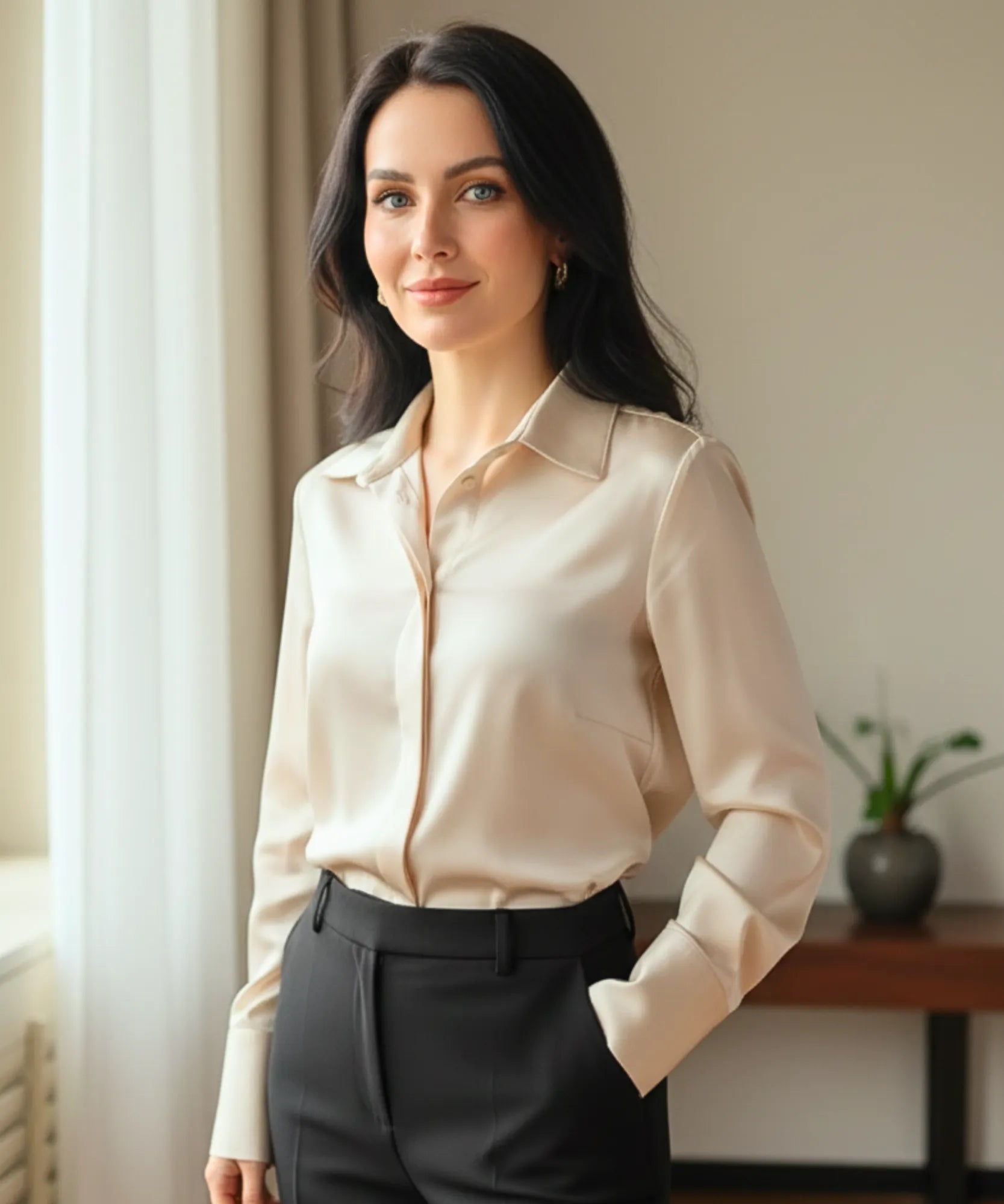 The women's long sleeve silky satin blouse instantly elevates any outfit with a refined and confident presence.