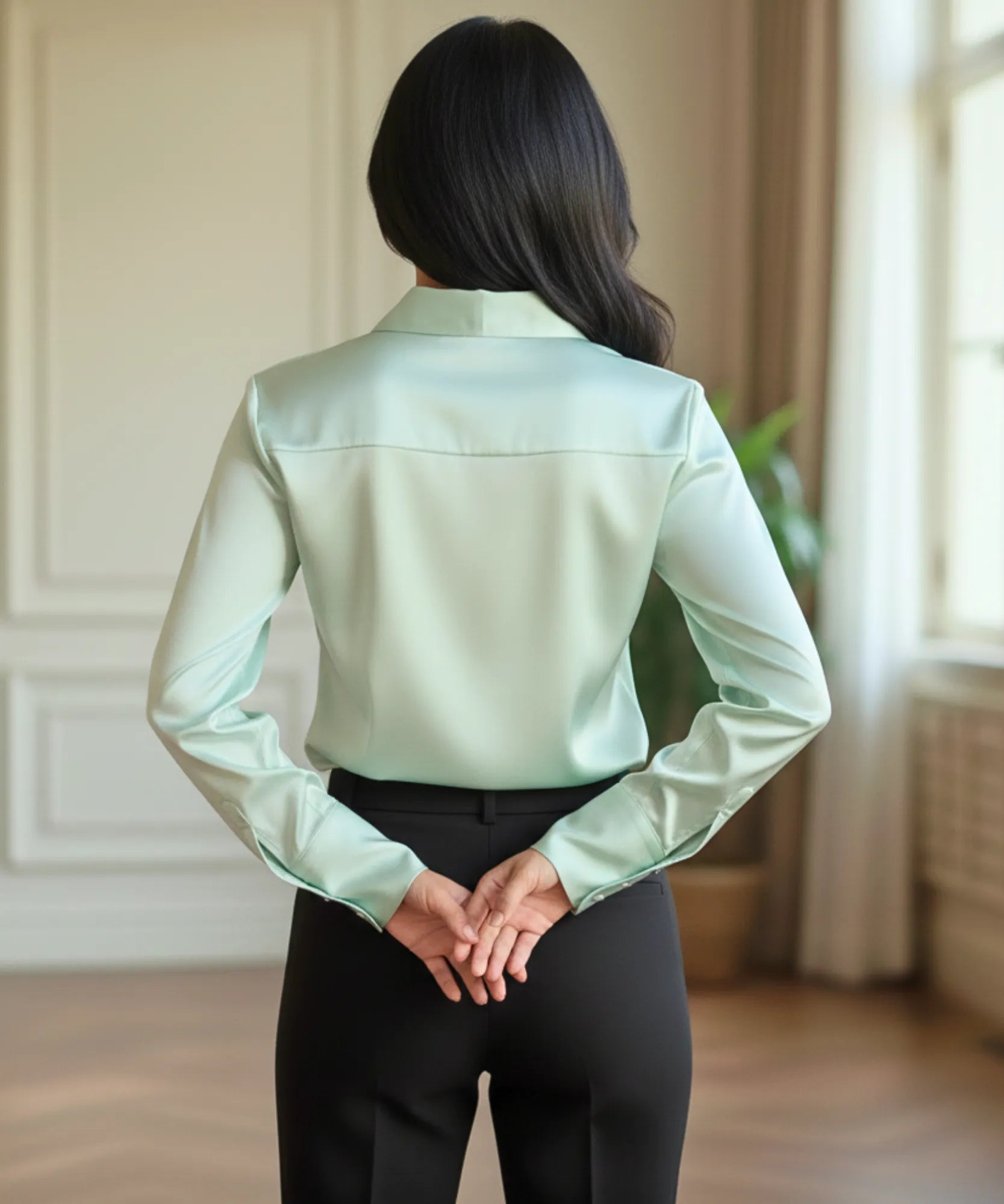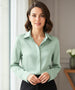 The women's long sleeve silky satin blouse fits seamlessly into workdays, professional meetings, and occasions that require a polished and elegant look.