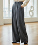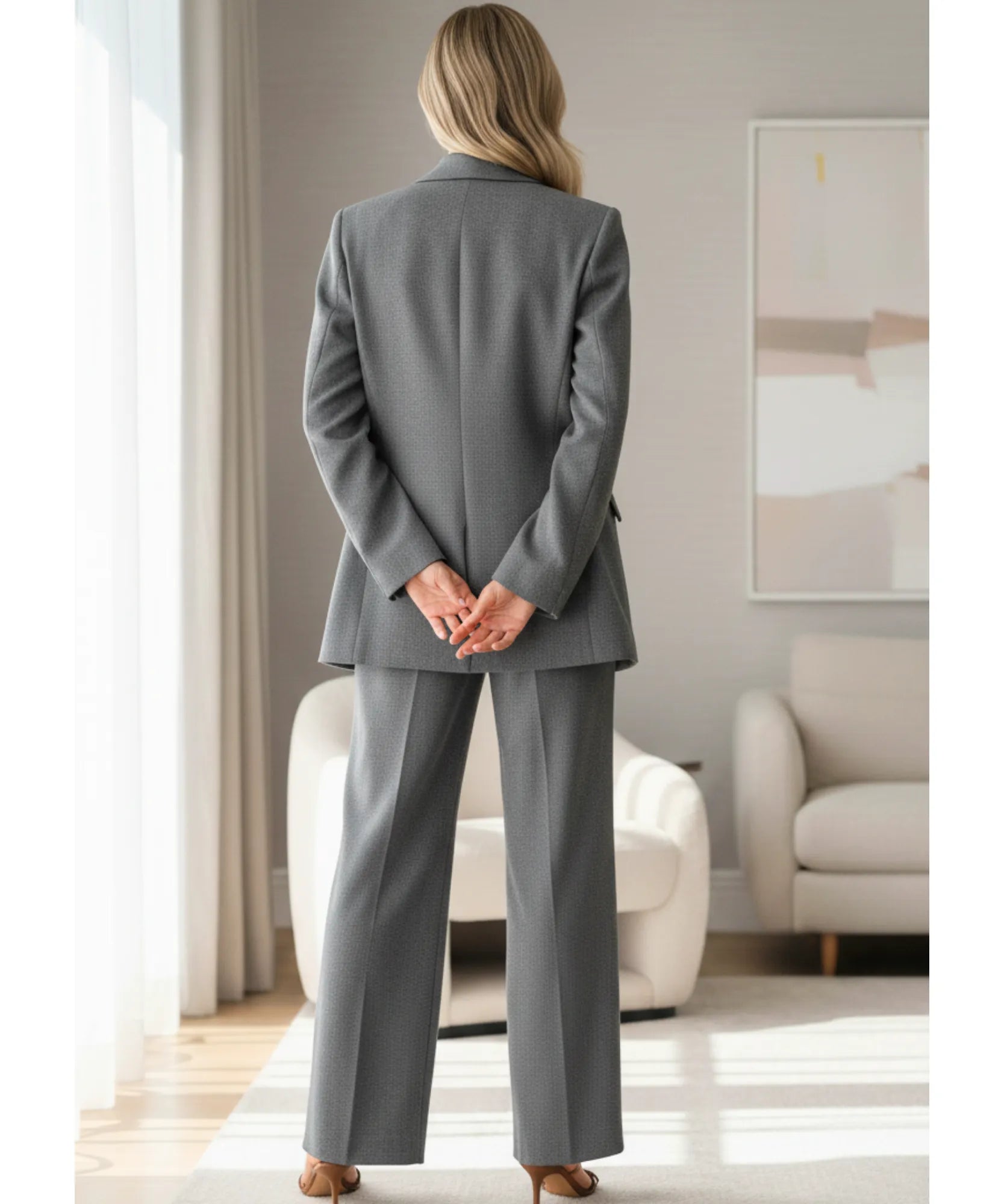 The blazer has a longer length and defined shoulders, while the pants feature a mid-rise waist and a straight leg cut that enhances posture.