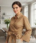 This women’s dressy wrap top has that kind of cut that transforms your outfit without trying too hard. The structured cotton fabric with a subtle satin touch adds polish, while the adjustable front tie highlights the waist and creates a distinctive silhouette.